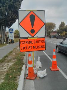 Cyclists merging sign blocking cycle path